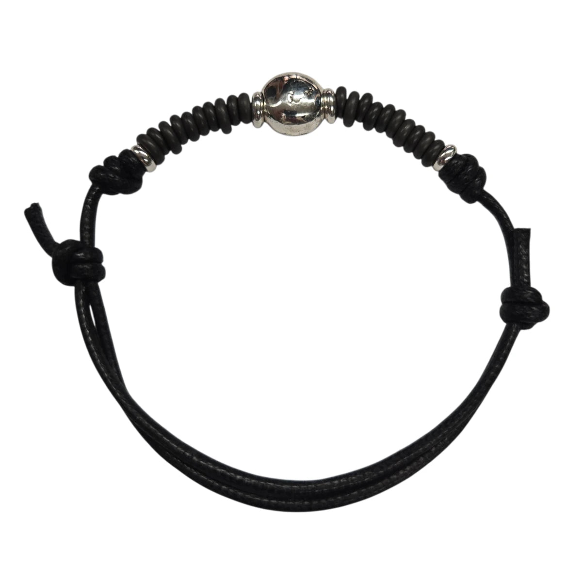 Bracciale con 20 rondelle in titanio, 4 rondelle in argento 925 e una pepita in argento 925 e cordino in tessuto nero