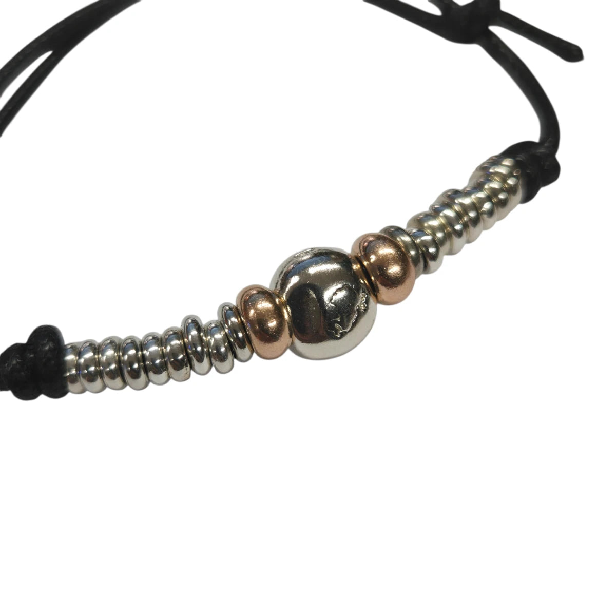 Bracciale con 18 rondelle in argento 925, due rondelle bold in argento placcato oro rosa 18kt e una pepita in argento 925 e cordino in tessuto nero