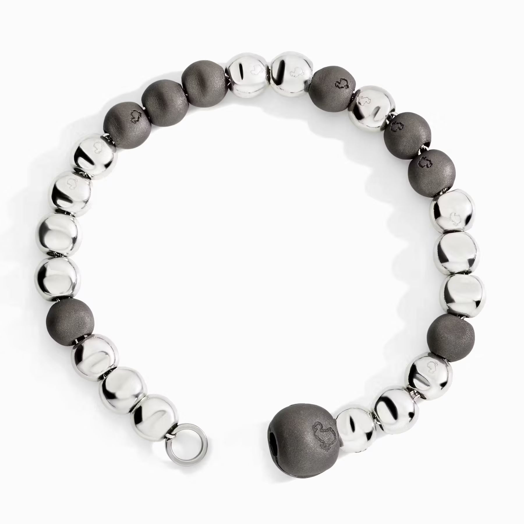 DoDo torna alle sue origini e reimmagina il bracciale Pepita con un nuovo equilibrio tra argento lucido e titanio, in un gioco di contrasti decisi. La nuova chiusura “shell” sostituisce il classico t-bar, donando al design un tocco audace e genderless. Stile essenziale e carattere distintivo: il bracciale Pepita propone una dichiarazione contemporanea di identità.