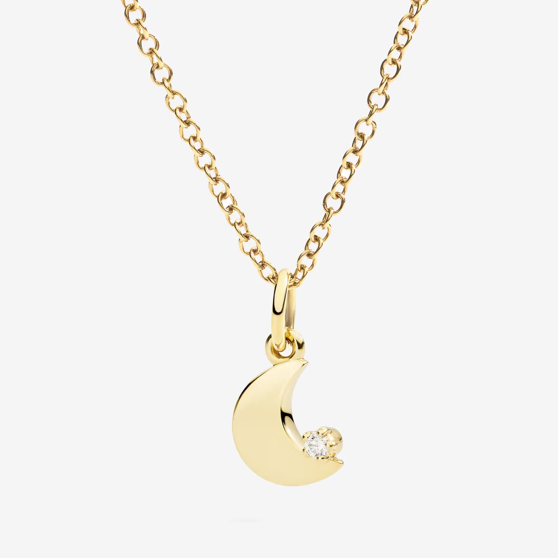 Ciondolo luna in oro giallo 9K con 1 diamante bianco (ct 0,03). Cordino nero incluso.