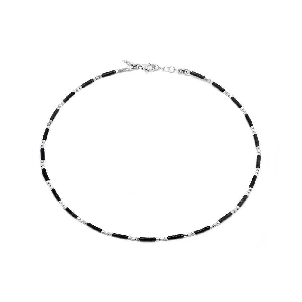 Tutta la semplice leggerezza di una collana contemporanea. Nella Collana Onice e Dadini, il colore nero della pietra ed elementi in argento fuso e brunito duettano al collo di un uomo, con prevalenza ritmica del decoro in onice. Realizzata a mano in azienda.