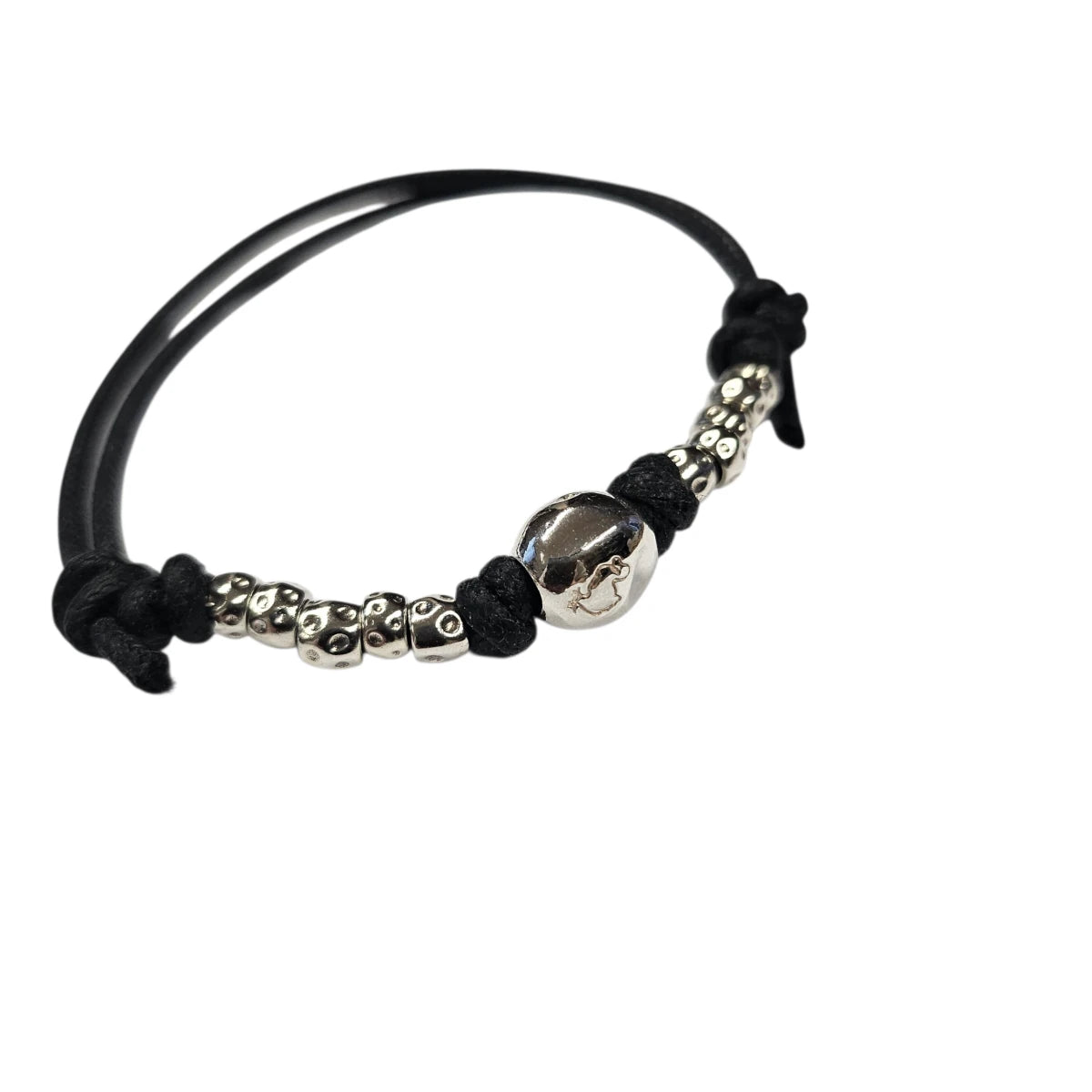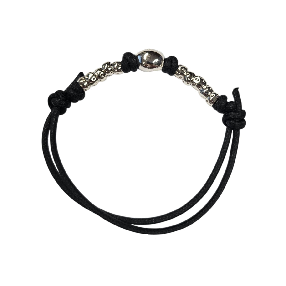 Bracciale in argento 925, cordino nero, 10 granelli in argento e una pepita in argento 925