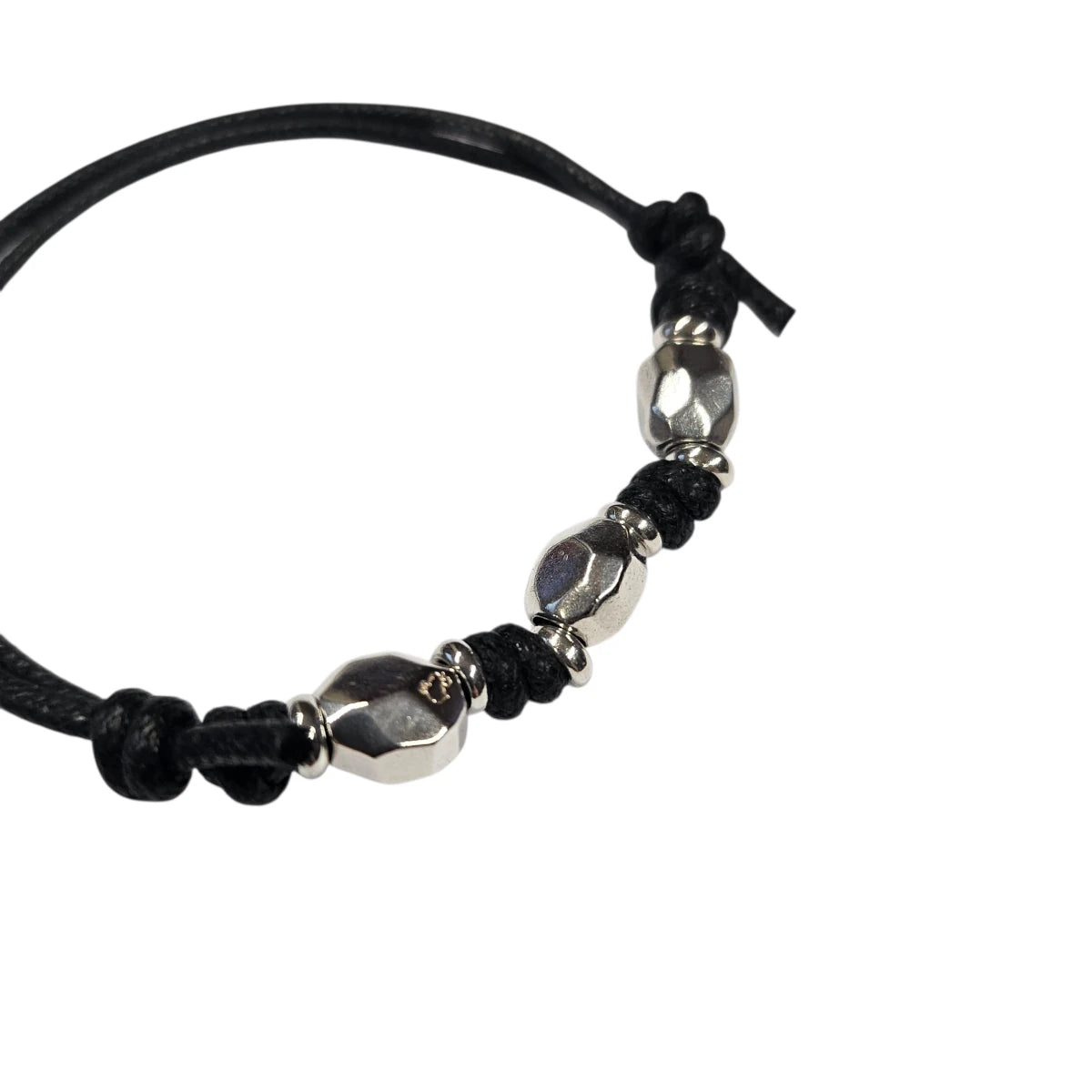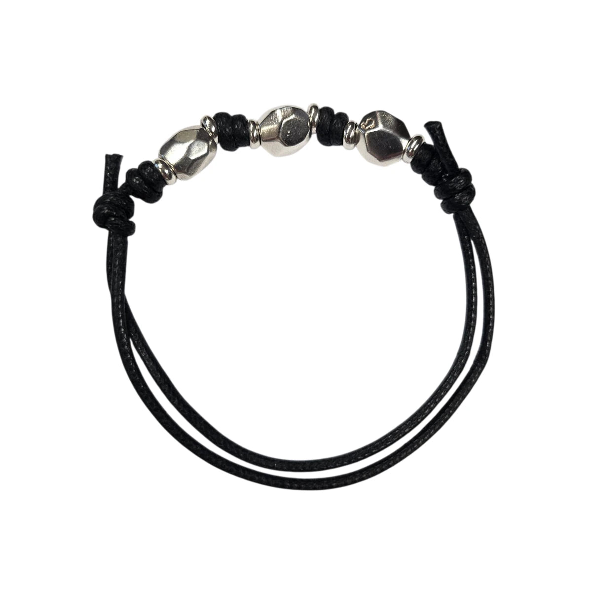 Bracciale in argento 925, cordino nero, 6 rondelle in argento e tre pepita in argento 925 sfaccettate