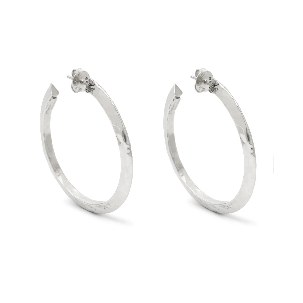 Grandi orecchini a cerchio in argento con una texture che regala una straordinaria lucentezza. Realizzati in azienda con lastra d'argento martellata a mano.