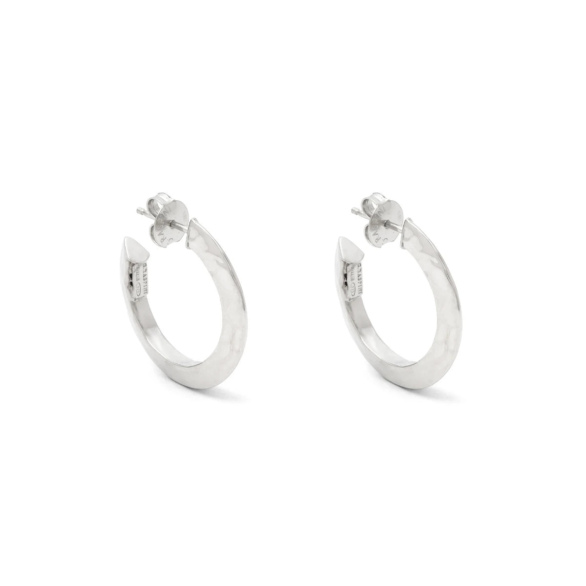 Grandi orecchini a cerchio in argento con una texture che regala una straordinaria lucentezza. Realizzati in azienda con lastra d'argento martellata a mano.