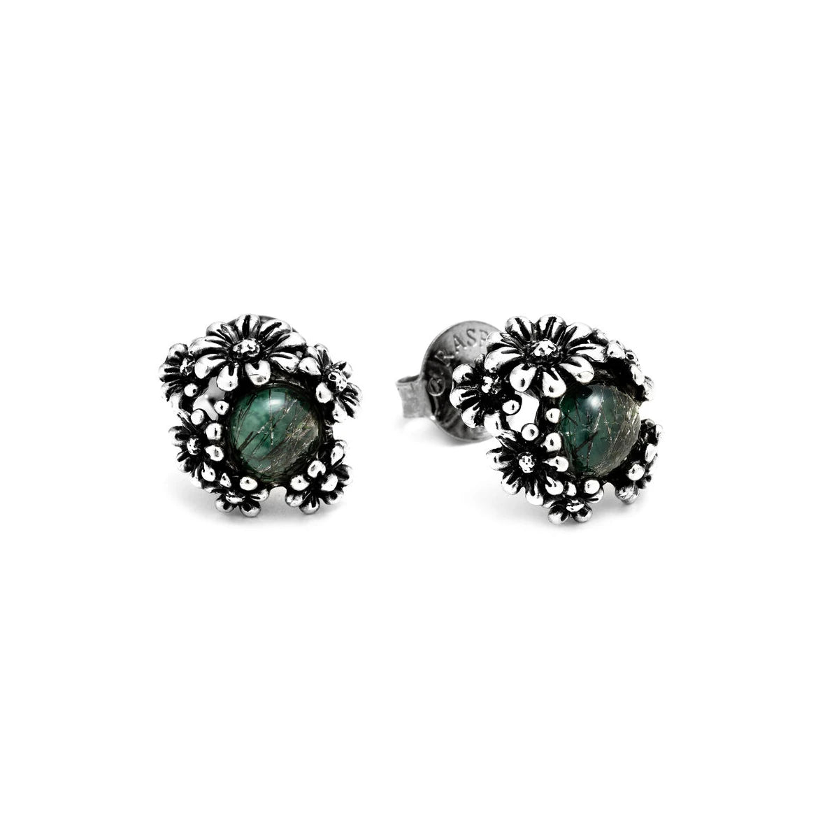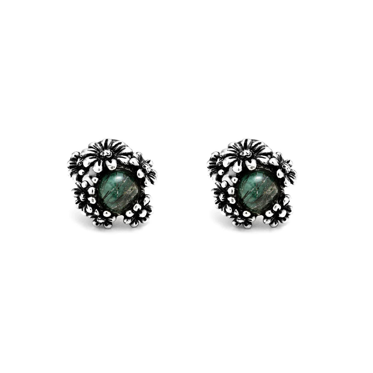 Questi raffinati orecchini a bottone in argento brunito sono impreziositi da un’agata verde che brilla al centro di un piccolo prato di micro-margherite cesellate. Un gioiello che unisce delicatezza e charme, dove ogni dettaglio racconta una poesia silenziosa.