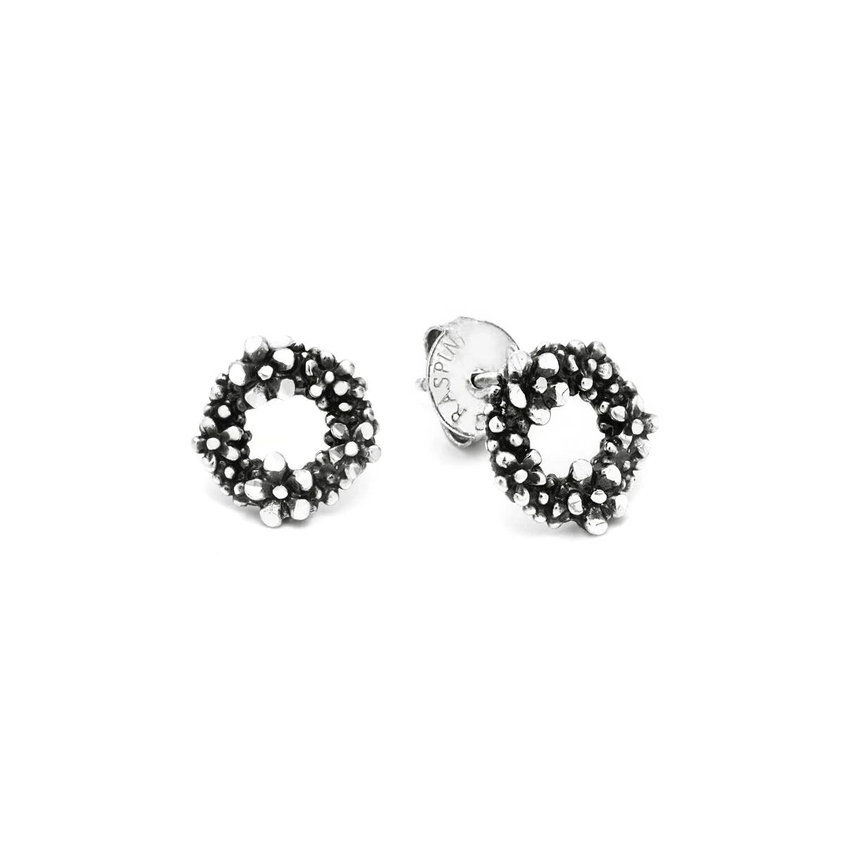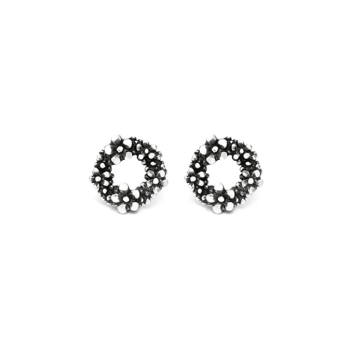 Piccoli fiori luminosi come cristalli. Gli orecchini bottone Millefiori sono realizzati a mano tramite fusione a cera persa. Particolare luminosità è sprigionata dai minuscoli e graziosi petali in argento diamantati.