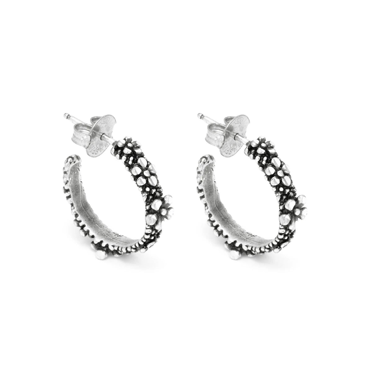Tutta la delicatezza del micro mondo floreale in questi orecchini a cerchio Giovanni Raspini. La lavorazione artigianale della fusione a cera persa su argento brunito, è qui abbinata all'effetto della diamantatura, che conferisce ai minuscoli e graziosi petali un effetto scintillante.