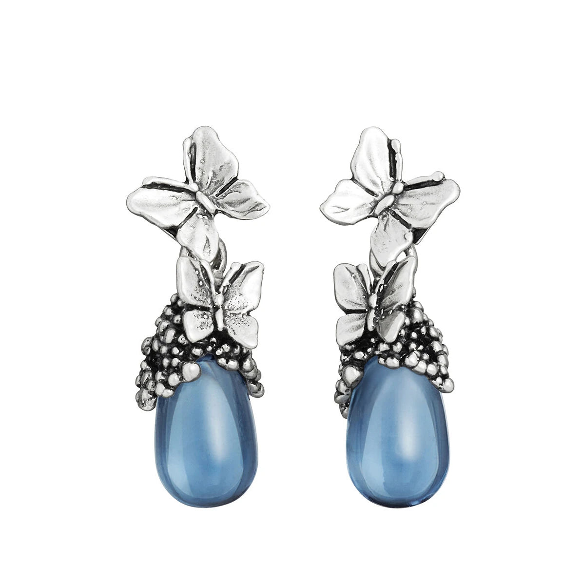 Gli orecchini Goccia Farfalle uniscono la delicatezza del decoro in argento, realizzato con la tecnica della fusione a cera persa e ispirato alla forma eterea delle farfalle, alla purezza di un cristallo a goccia in una luminosa tonalità blu ciano. Realizzati a mano in azienda.